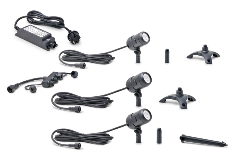 ALLES DABEI: Komplettset aus drei weißen IP68 Spots mit 3 m Kabel, Dreifach-Verteiler und 36 W Netzteil