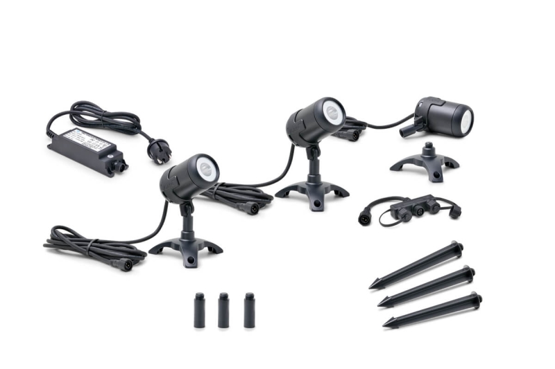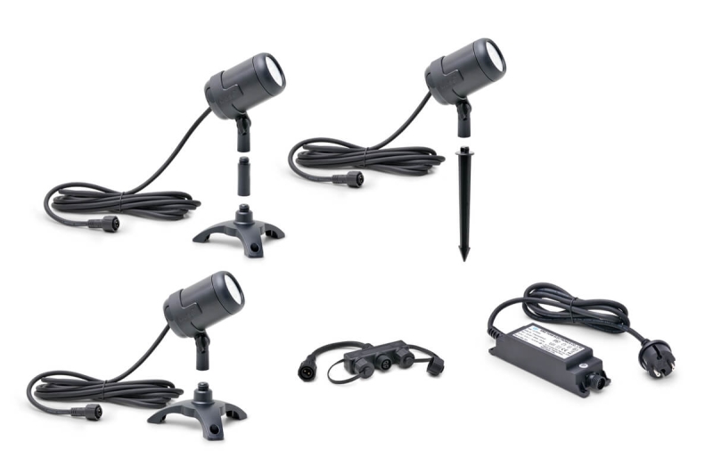 ALLES DABEI: Komplettset aus drei weißen IP68 Spots mit 3 m Kabel, Dreifach-Verteiler und 36 W Netzteil